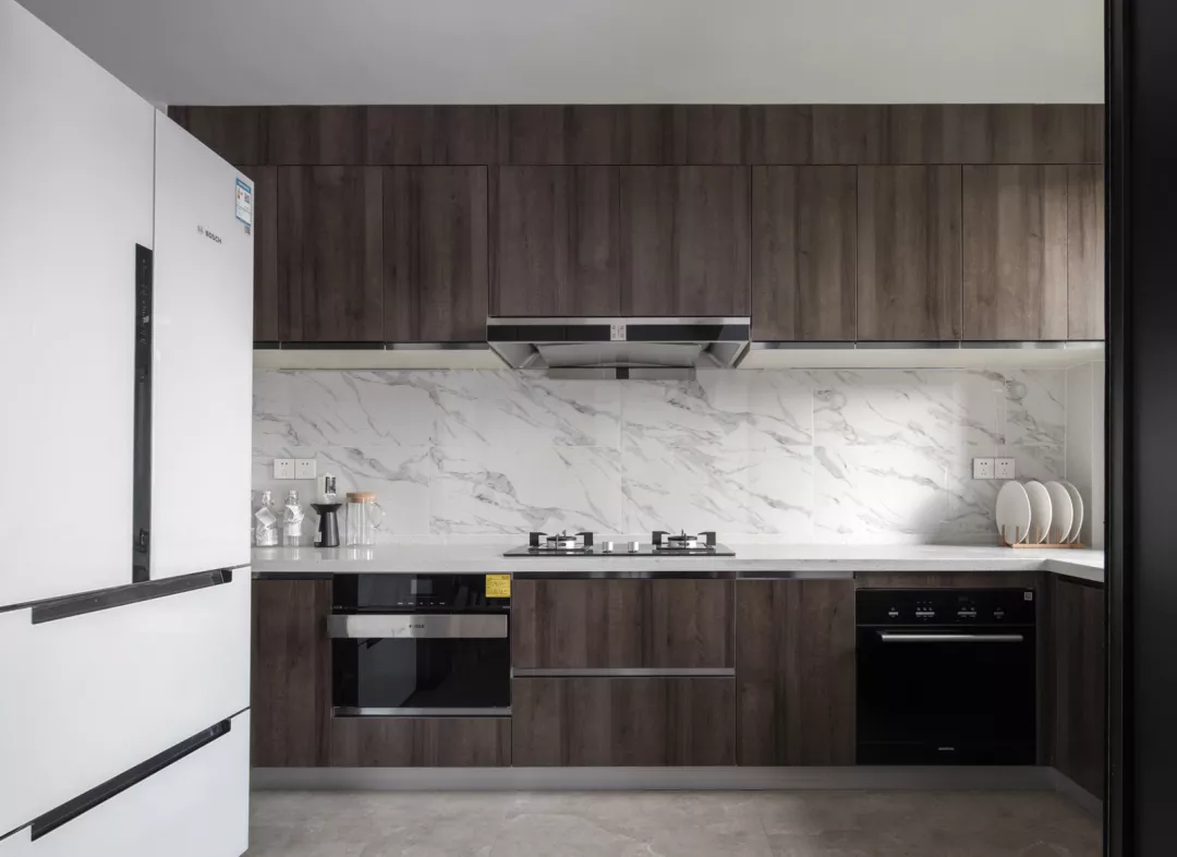餐厅后方就是厨房空间,L型布局橱柜,冰箱摆放在厨房一侧,以灰色地砖搭配白色墙砖和木质橱柜,整体显得很有轻奢感。