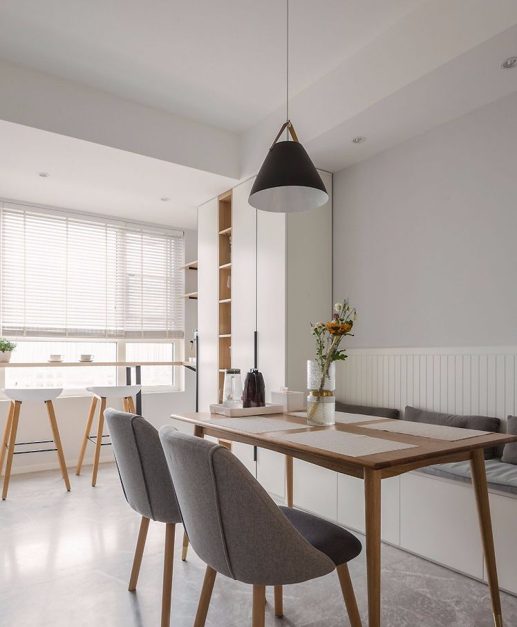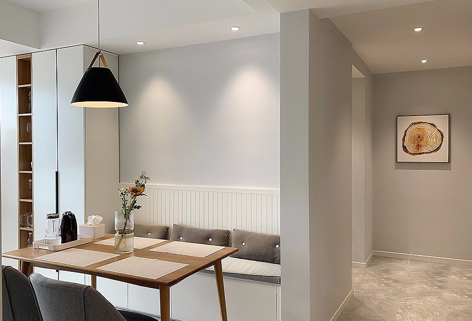 餐厅以卡座加壁柜的形式,最大化的利用空间。节省空间的同时还增加了收纳空间,木色与白色的结合,让整个餐厅氛围变得自然、舒适。