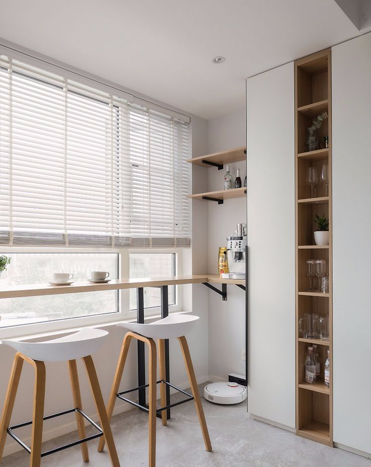 餐厅临窗设置休闲吧台,右侧墙面上的开放式层板,可随心摆放屋主需要的物件。在这里喝下午茶或看书、工作,都是不错的选择,小资情调满满。