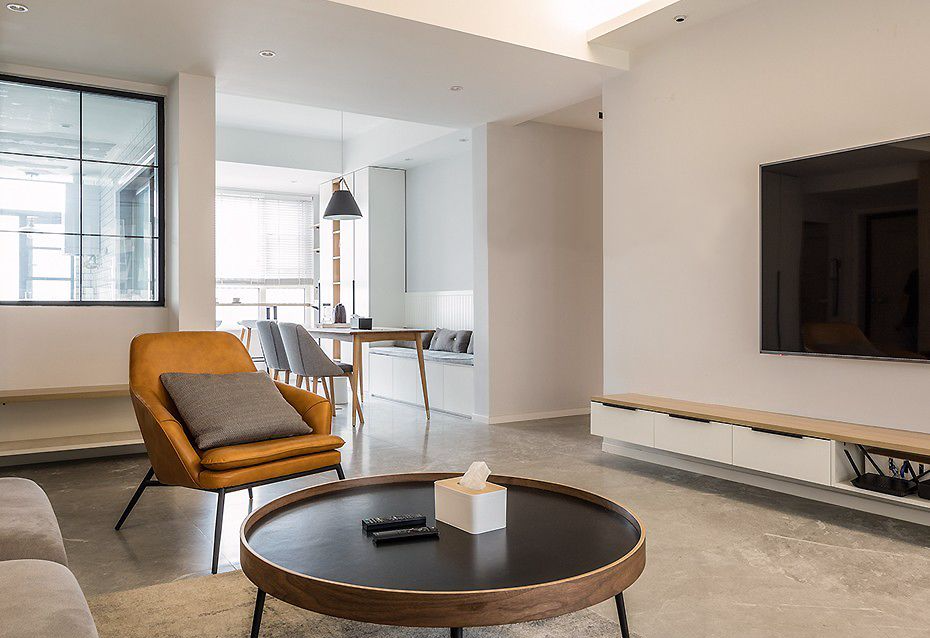 一把姜黄色皮质单椅点缀提亮,瞬间打破灰色空间的单调性。