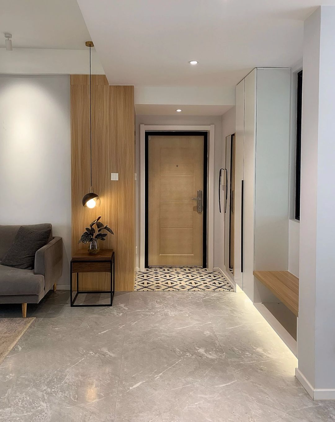 进门玄关处一张几何地毯,在视觉上增添空间层次感。一块横木板充当换鞋凳,简单随性,底部留空的方式,方便日常放置鞋子。
