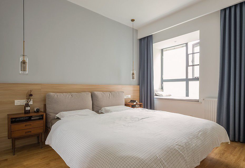 卧室,床头背景墙木质护墙板+灰蓝色漆面的结合,清净、自然。黄铜玻璃吊灯,带来现代的造型和别致的触感。