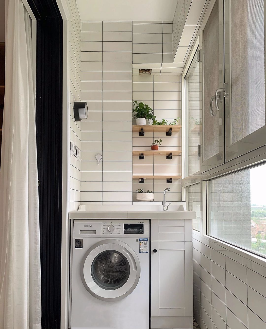 阳台做了一个嵌入式的洗衣机柜,干净整洁。地面花砖搭配墙面白条小砖,一看就是北欧风格。