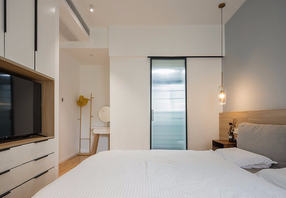 白色衣柜搭配黑色拉手,中间留空嵌入电视,既满足了实际的使用需求,也更有效地利用了空间。