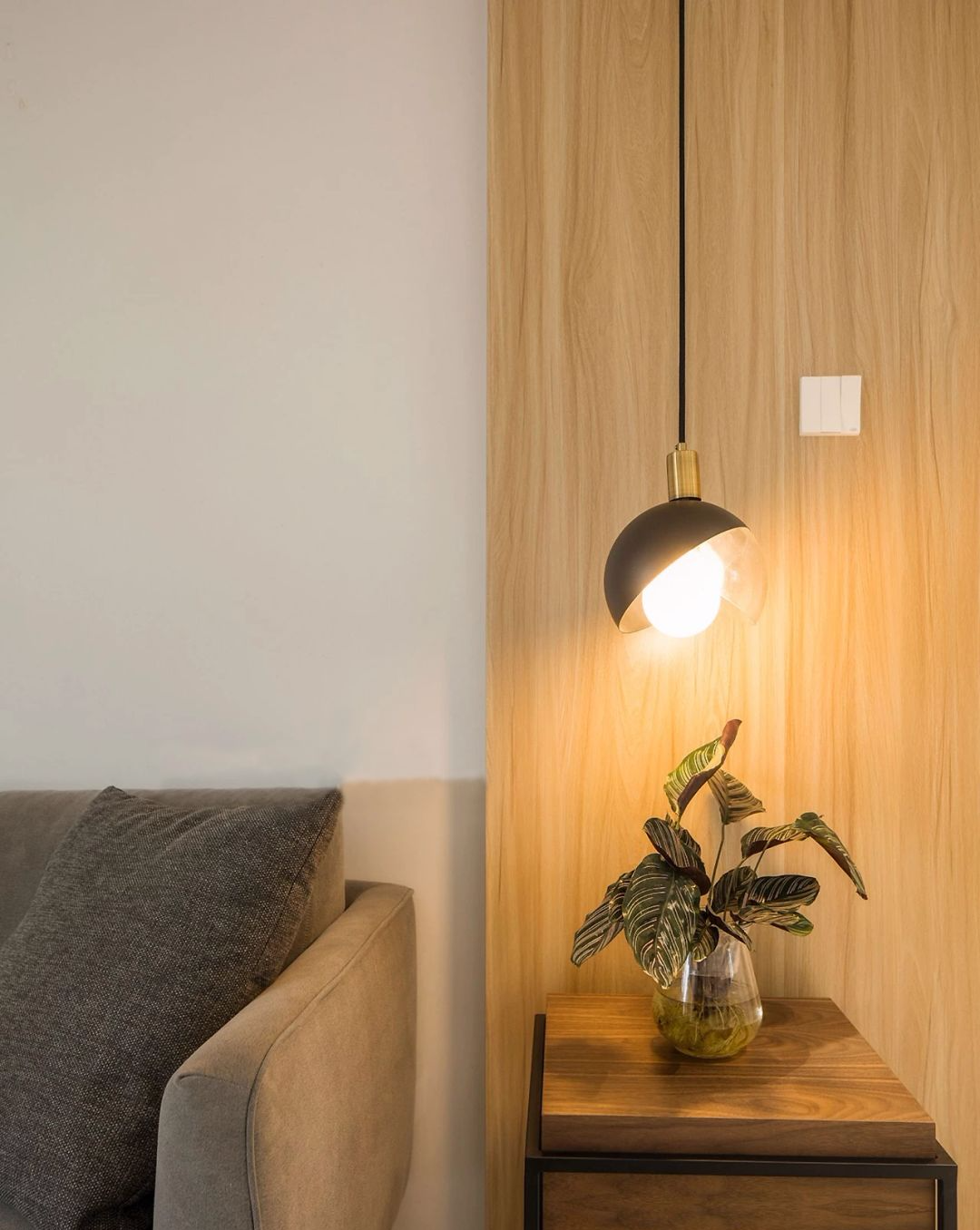 沙发一侧、胡桃木色的铁艺边几上方,一盏极简创意灯具搭配生机勃勃的绿植,令整个空间韵味盎然。