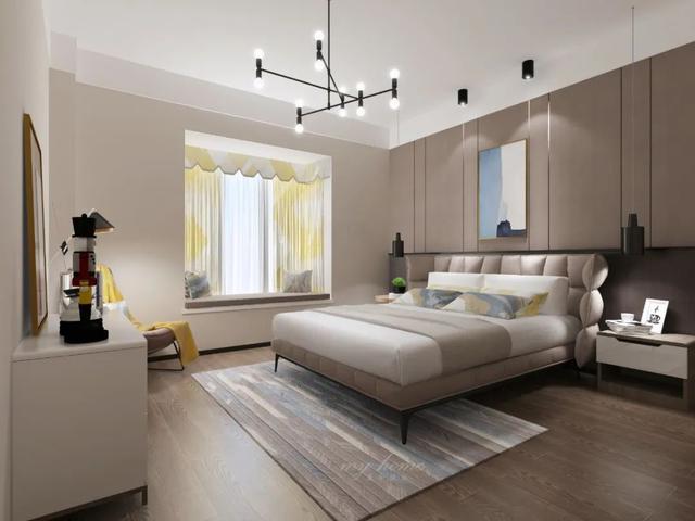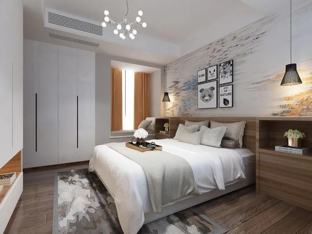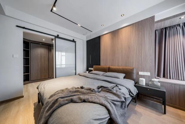 如果不喜欢软硬包的皮革或布艺表面材质,也可以选择纯粹的木饰面作为床头墙靠背,质感也是非常简约舒适,并且适当加入长城板等设计,也能提升卧室空间的现代时尚感。