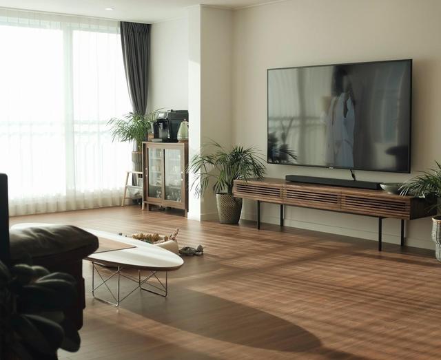 这套房子就采用了棕色系的沙发、原木色的柜子,再搭配上绿色的窗景,虽然看起来不够明艳,却有一种令人舒适的成熟、优雅的味道。