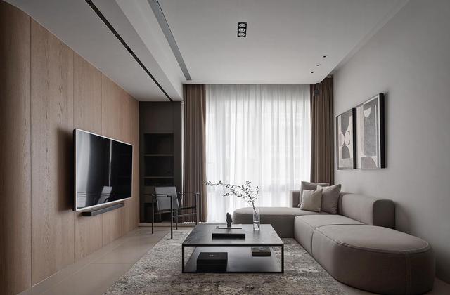 硬装部分采用温柔的杏色/奶茶色,用深木色的家具来作为重点色,整个空间的明暗层次感就出来了。