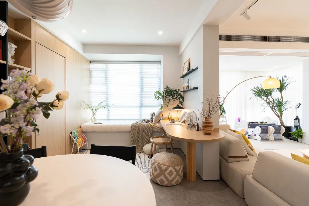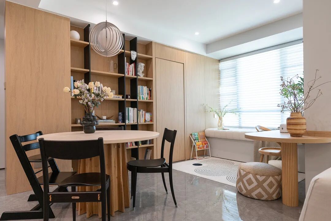暖调原木与米白色的碰撞,在感官上带来秋日暖意。也仿佛是在表达书本是春日烂漫的鲜花,桌上粒粒米饭是秋日金黄的果实。
