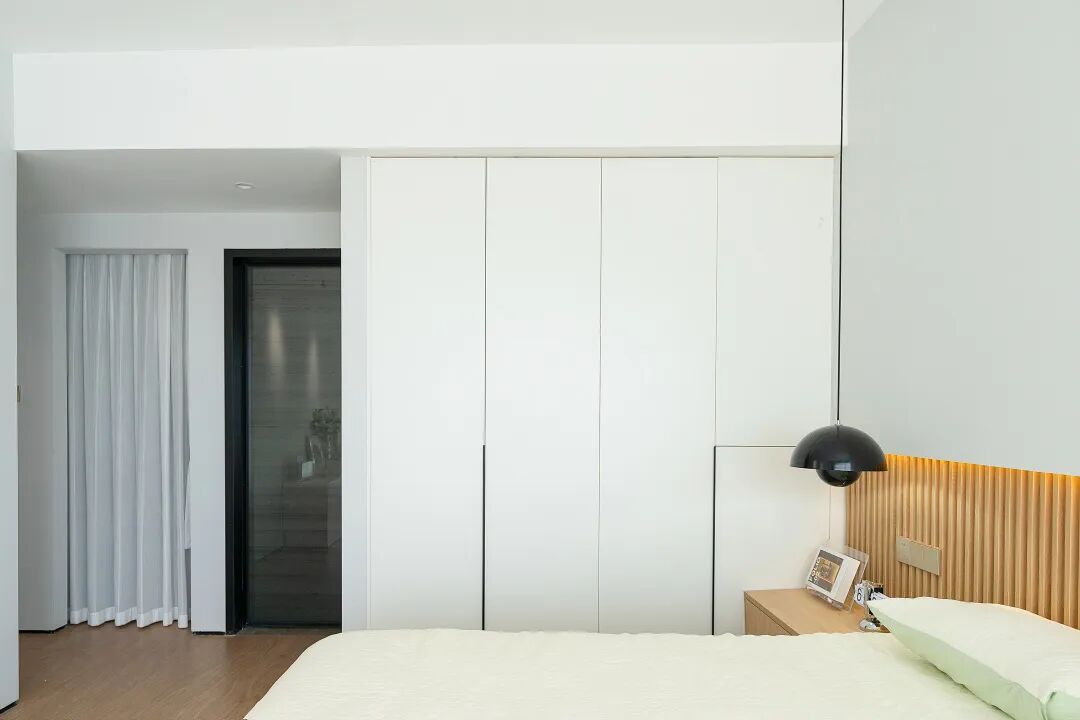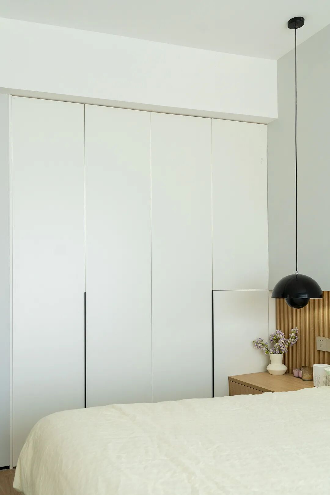 床头柜与衣柜一体化的设计,让房间简单的同时又极具设计格调。床头柜下方镂空增加空间的视觉穿透感,避免单一的空洞感。