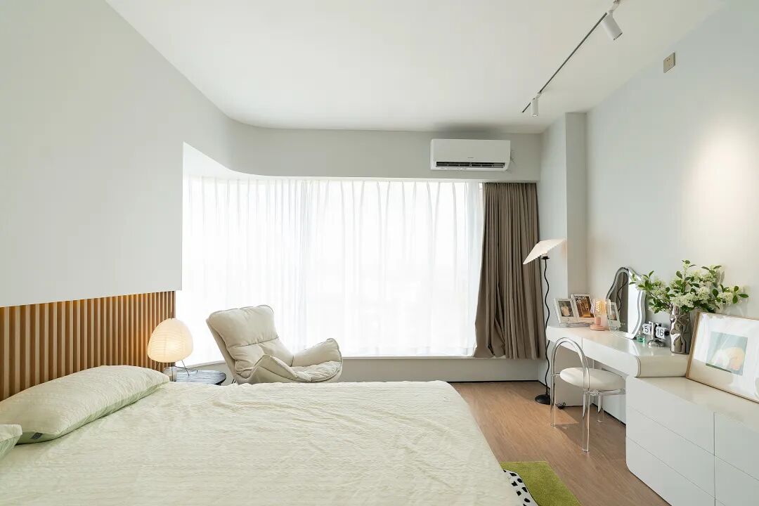 纯粹的白色与温润的木质色调相搭配,木栅格点缀床头背景墙,避免空间过于单调增加空间层次变化。