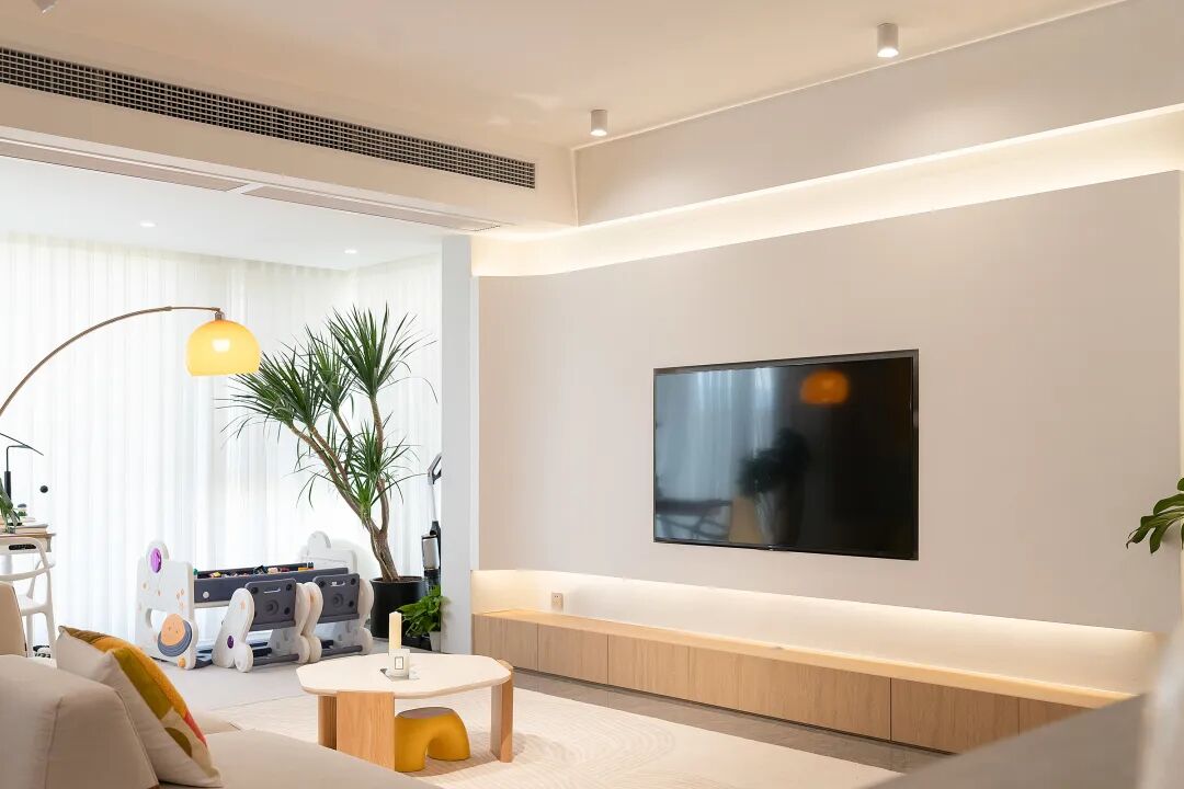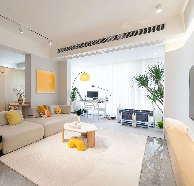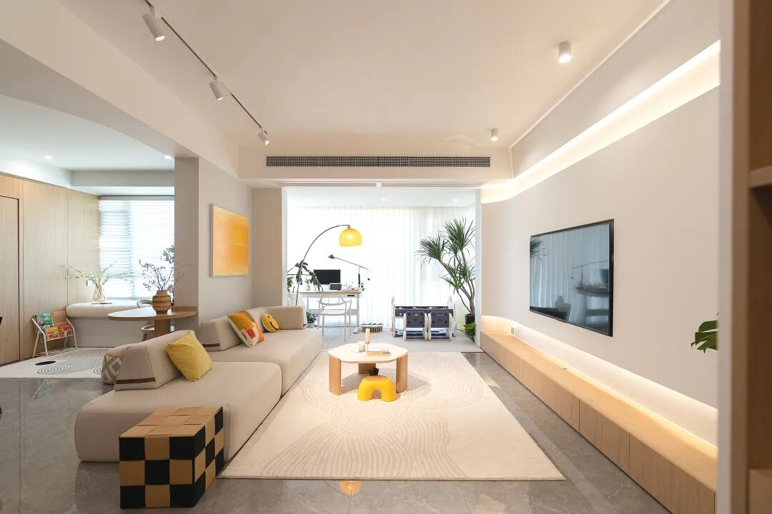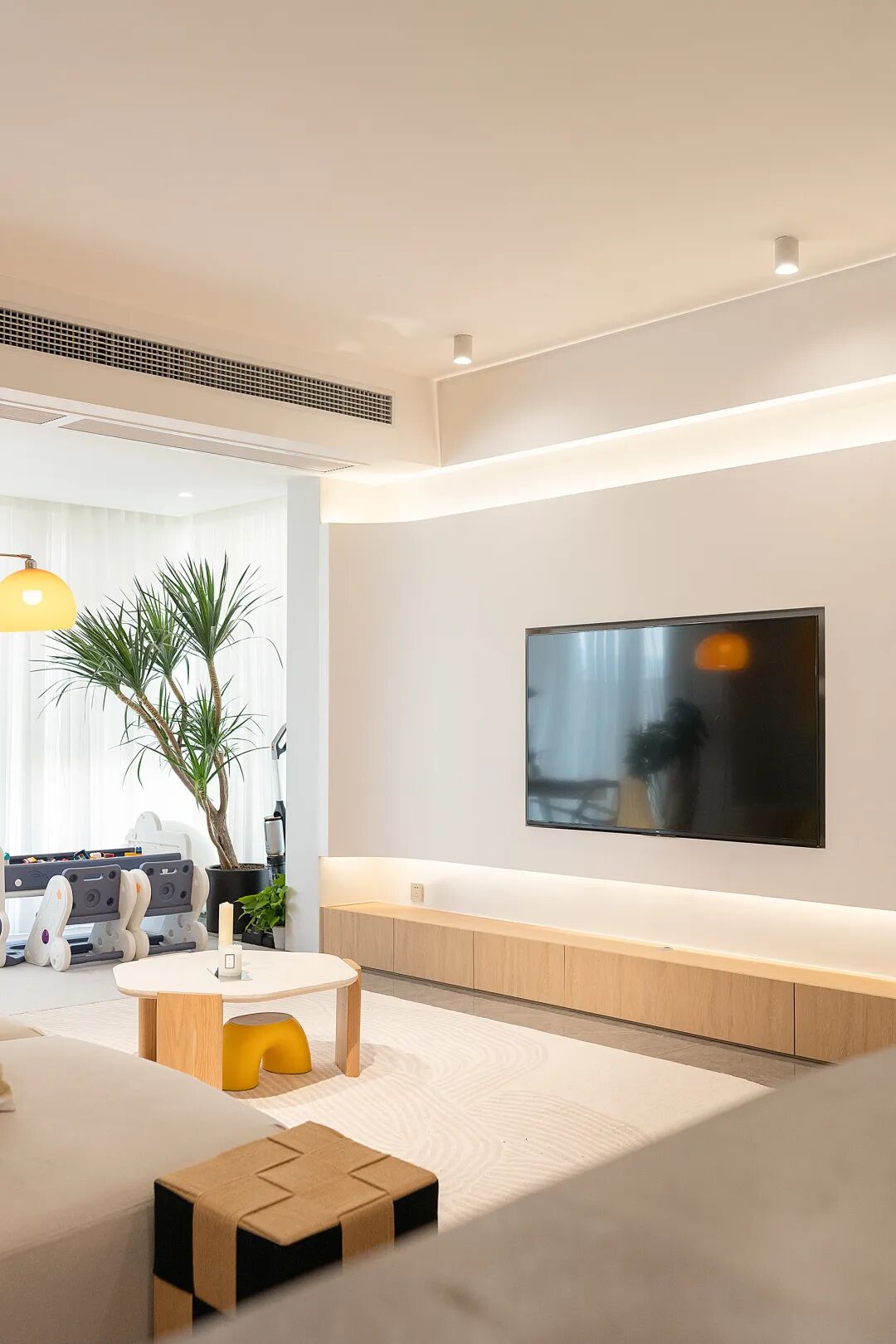 无主灯设计,减少装饰,为整个空间去繁就简使空间更加纯粹干净。阳台纳入客厅生活区,采光通风效果都得到了极大的提升。