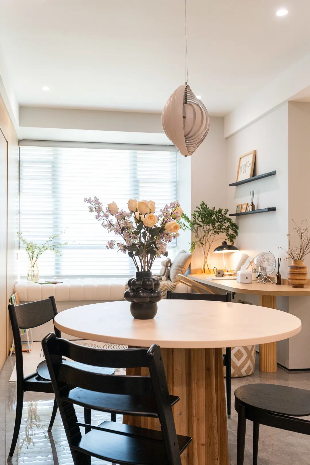 温润光洁的木质餐桌搭配醇黑的座椅,既保留了木质家具带来的稳重气韵又避免了过度饱和带来的压迫感。