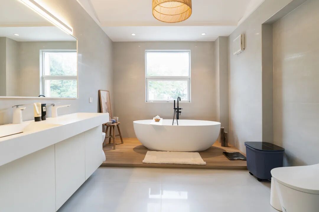 玻璃门与木质地台将卫生间分为三个区域;淋浴区、洗漱区、泡澡区,功能区分明确。