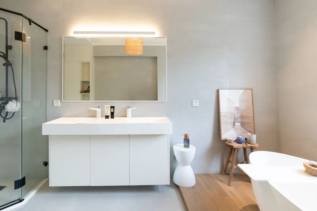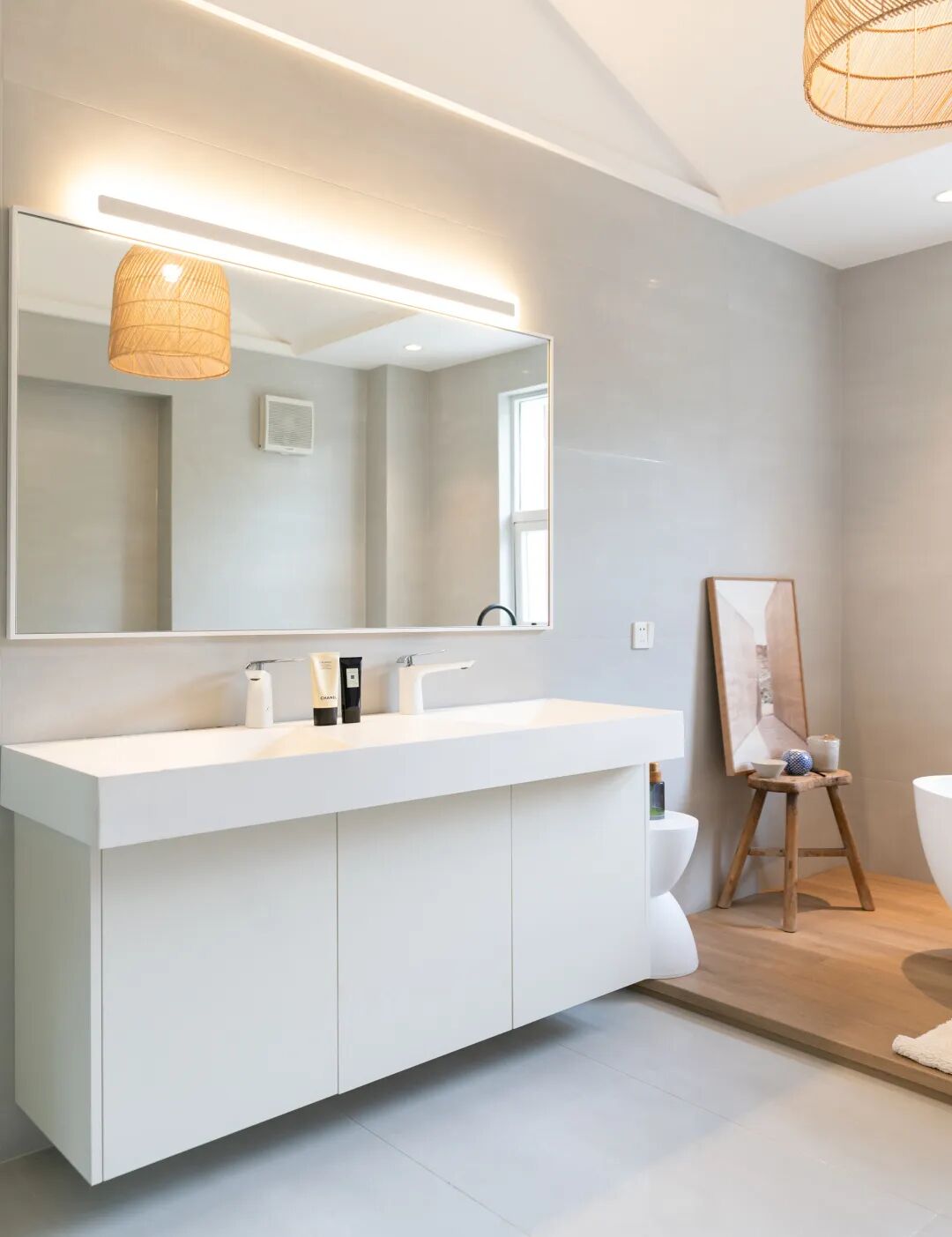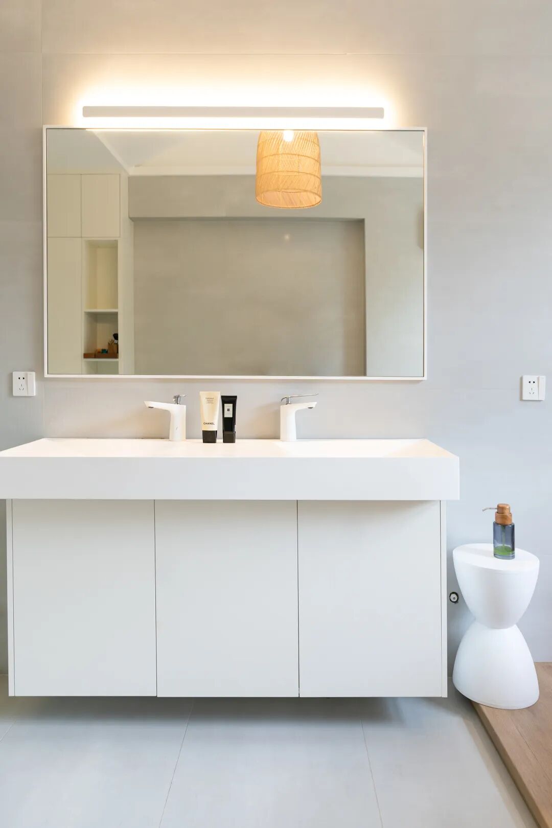 纯白的大理石洗漱台与半悬式浴室柜相融合,尽显至纯至美。不落地式浴柜设计不仅是为了美观,更多是防止积水藏污,让浴室时刻保持高颜值!