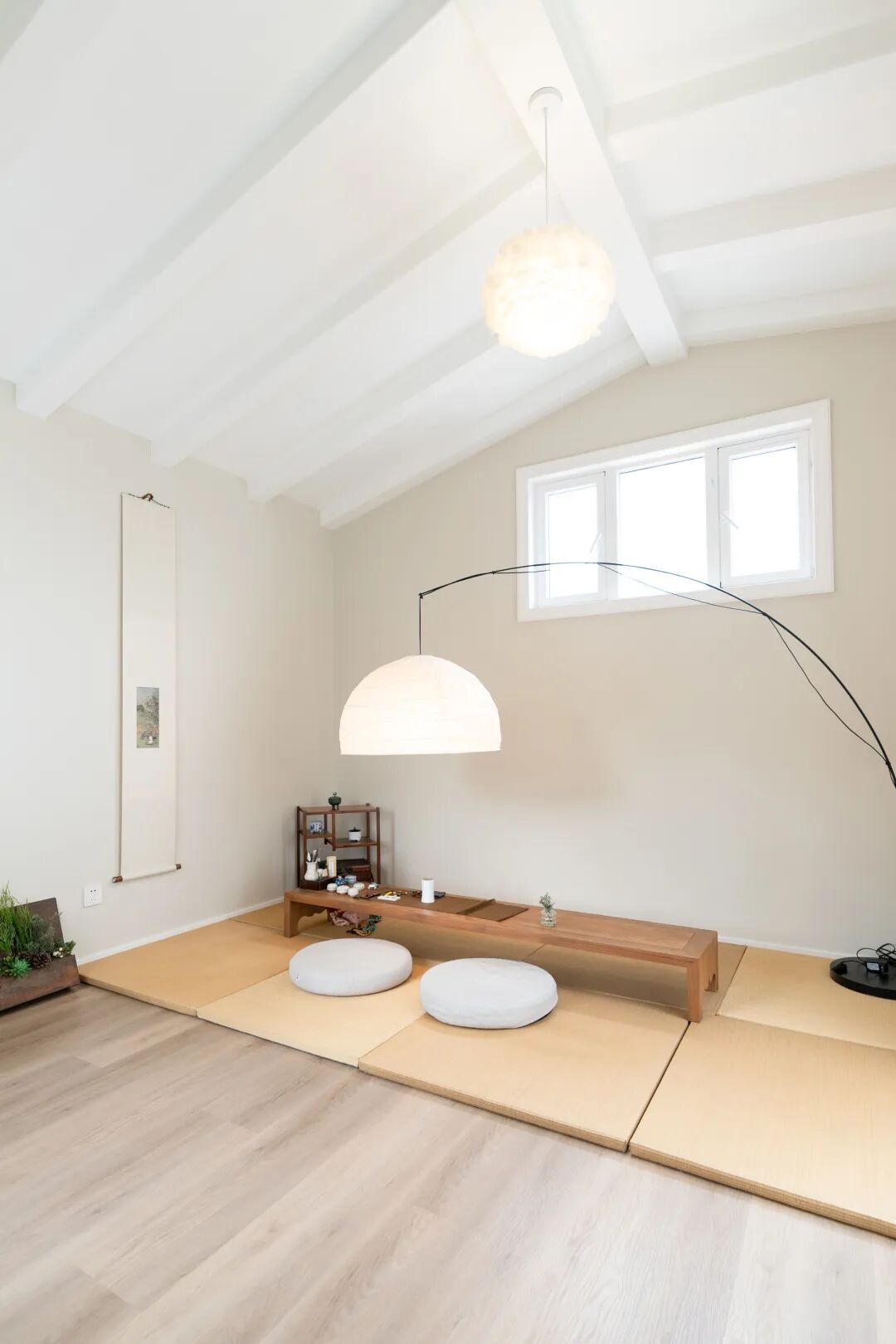 利用小阁楼为女主人打造冥想室,大面积的留白与温润的原木色调塑造安稳宁静的氛围,同时大片空地也能成为女主人练瑜伽的场所。