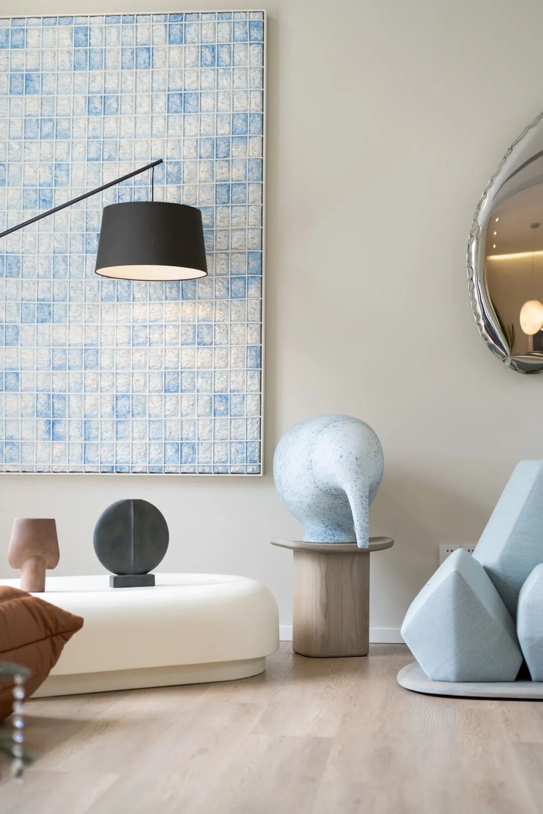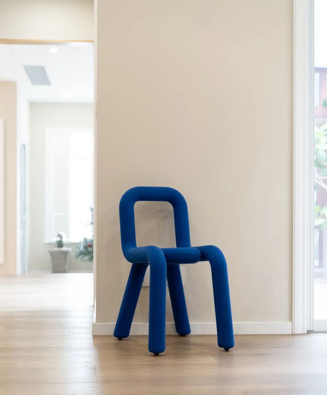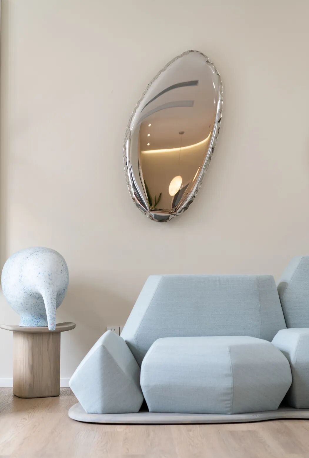 墙面不锈钢水滴装饰与克莱因蓝的异形椅子又打破了空间一如既往的质朴调性,带出张弛有度的空间氛围。