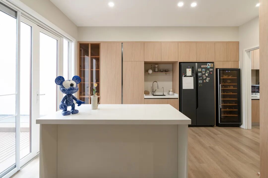 设置水池和大理石台面,满足收纳的同时也可作西厨使用;厨房电器内嵌柜体,视觉统一清爽。