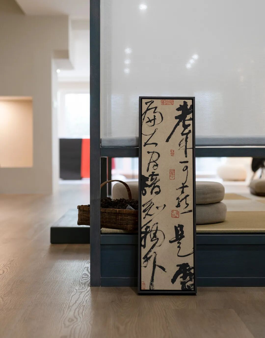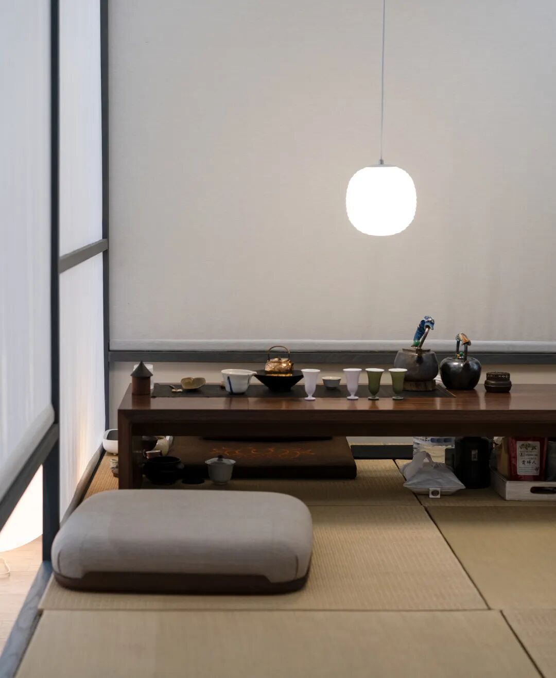 地面抬高,铺上藤编茶席;木质矮桌搭配浅灰蒲团,删繁去奢、精在体宜,紧靠自然之美散发出古雅而清朗的魅力。