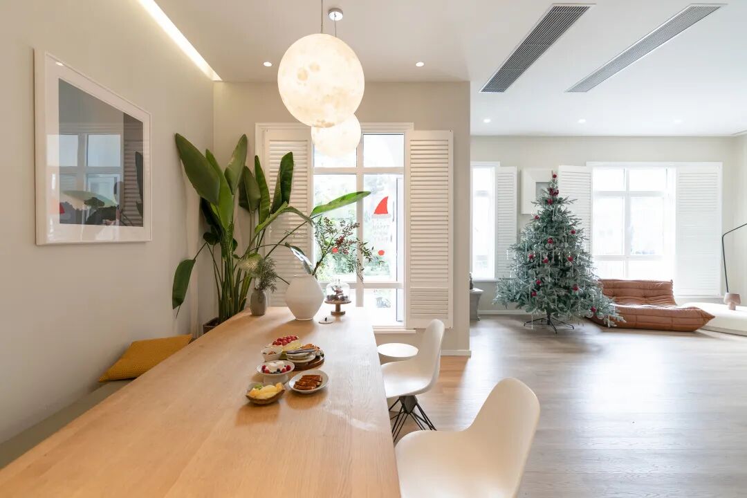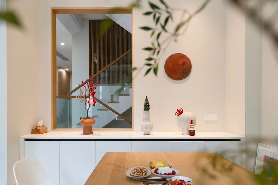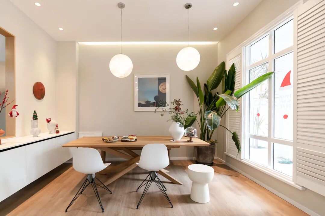 客餐厅一体化,开放式布局让空间更加通透;阳光透过明亮的落地窗,秋日的暖意在室内流转。在自然光的映射下,角落那抹绿意也更显生机。