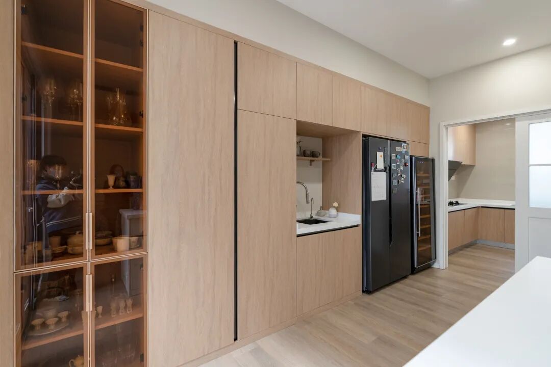 到顶原木色橱柜搭配半边茶色玻璃柜,一扫整墙柜体的沉闷。玻璃柜中点缀收藏许久的杯碟、手工艺品,细觉岁月悠悠。