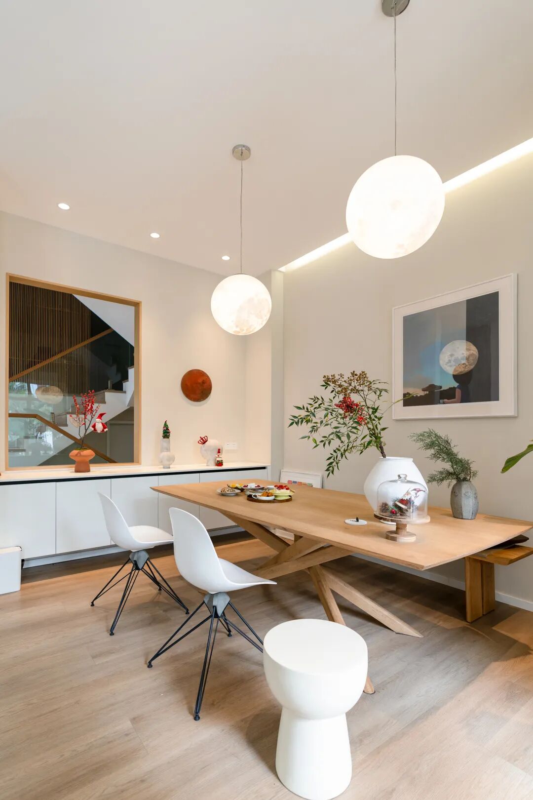 拆除一楼中的细碎空间,塑造了空间的整体性。通过无主灯设计、隐藏式光源、局部重点照明来营造出错落的光影,烘托出舒缓静谧的氛围。