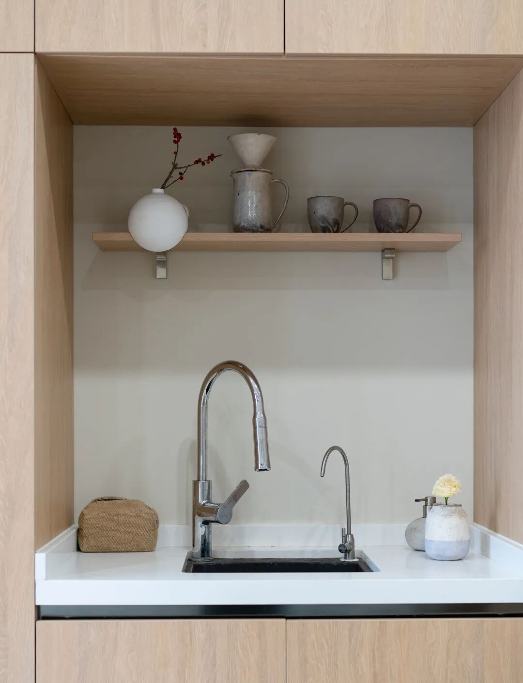 低饱和的原木色与浅灰将空间包裹,让静谧、纯粹的氛围蔓延。