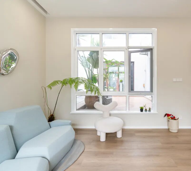 随意摆设的面包沙发,满足着最基本功能的同时尽量保持布局中的“空”,呈现简约而随意的美。