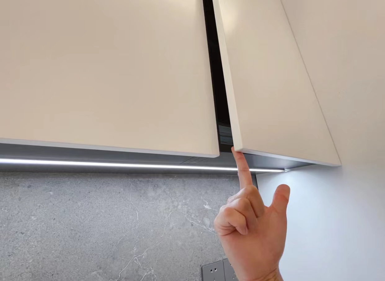 不用反弹器,又嫌弃明装把手不美观,这个时候,吊柜可以用柜门“下挂1㎝”的方式来解决。简单可以理解为柜门多出来1㎝。这样开门的方式就直接改变了。轻轻用手一拨就能将柜门打开。