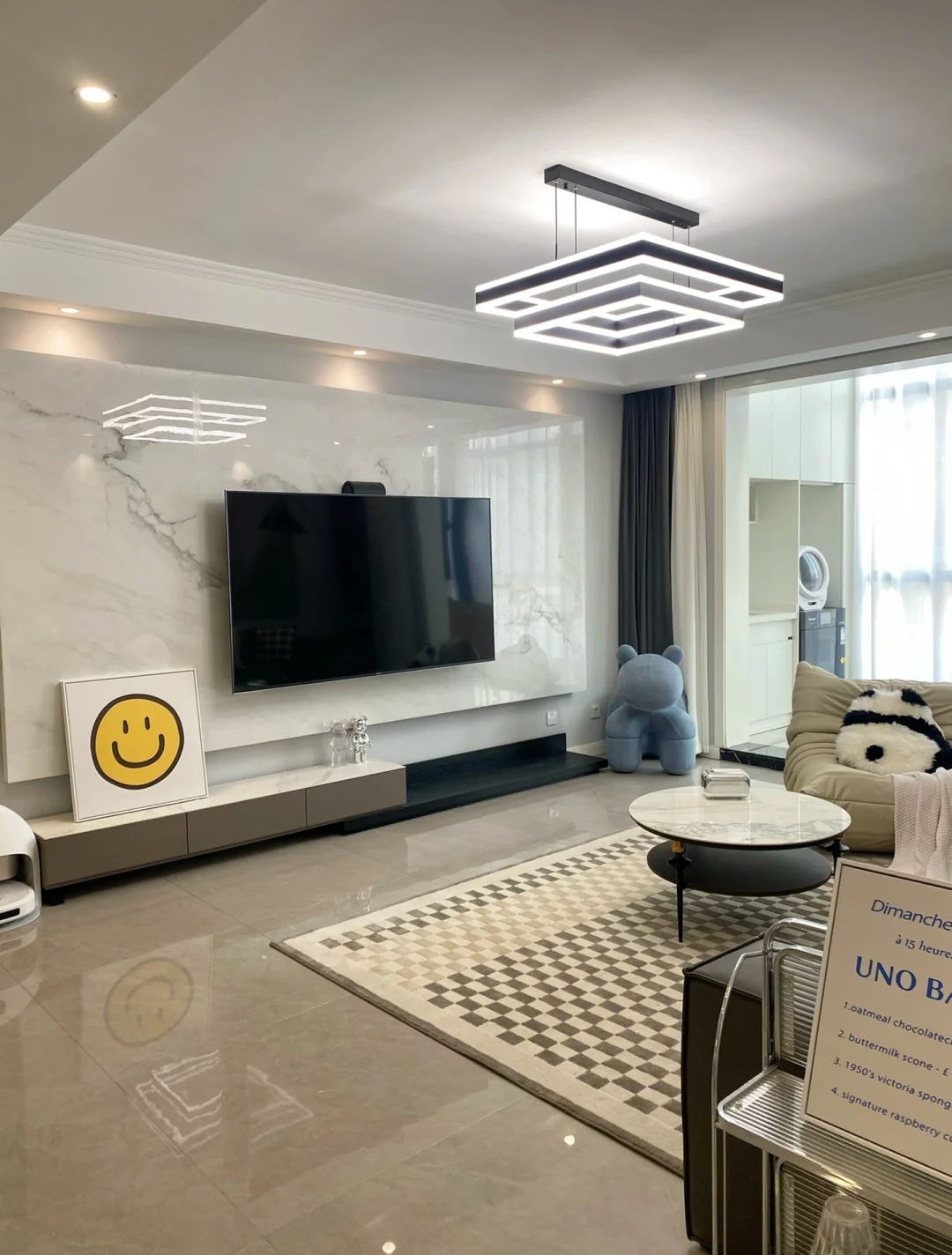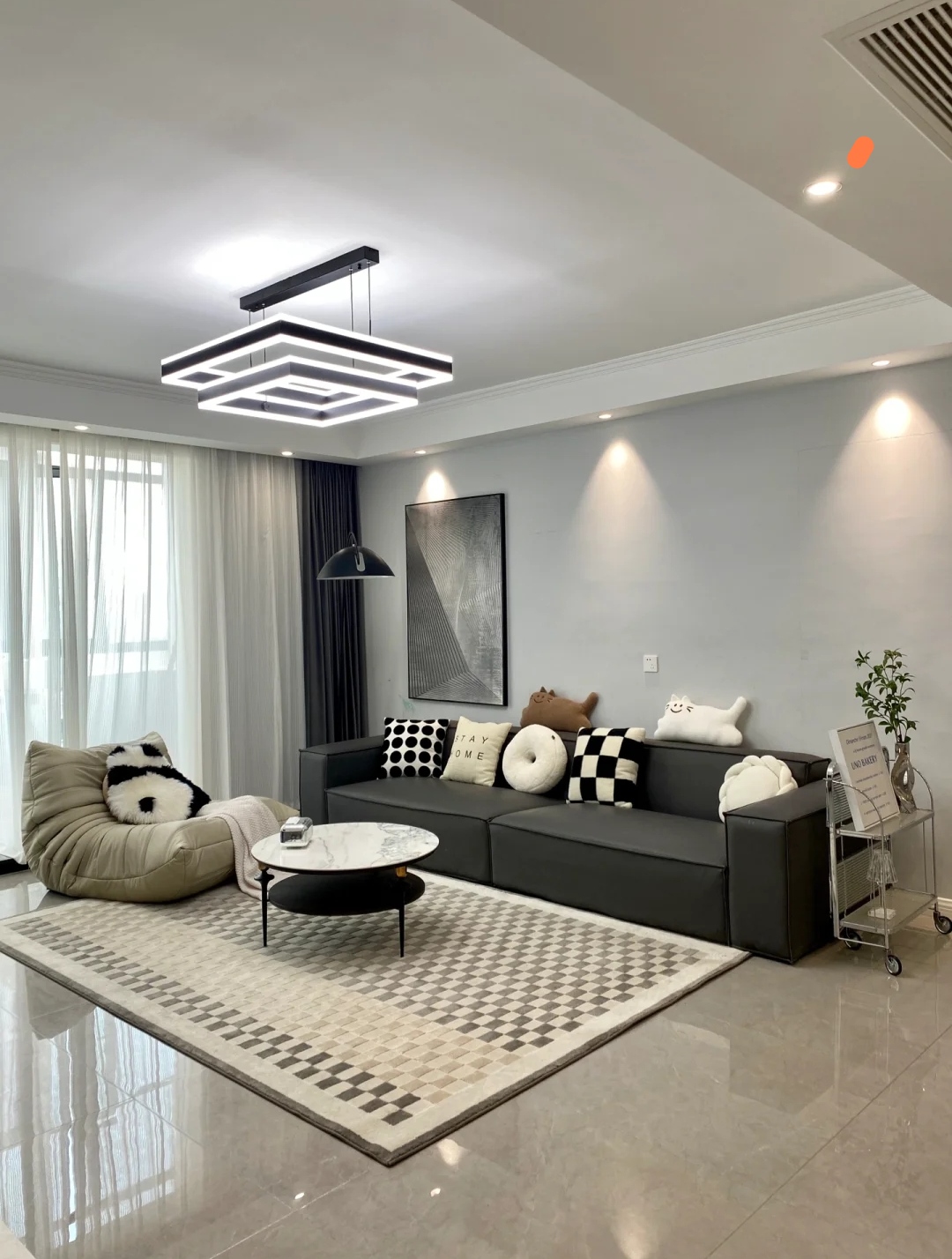 主灯采用几何系列的方形吊灯,双向发光,简单简约的设计看起来却让空间多了一些高级感,三色无极变光随意调节明暗程度,再也不用担心客厅亮度不够了。