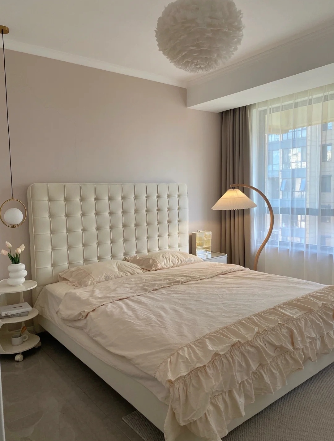 窗帘是奶茶色白色雪纺纱,垂坠感非常好,做的两倍韩式褶折,整个卧室太温馨了,温馨的主卧一定要有个羊毛地毯,暖乎乎的太酥服了。