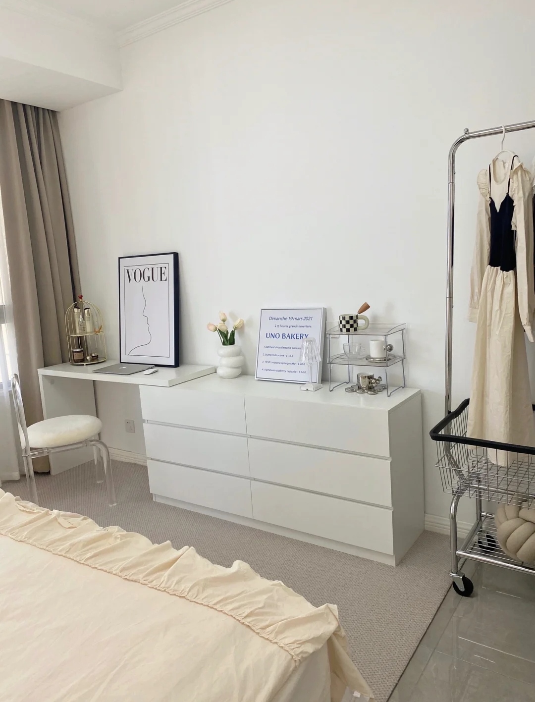 床尾放了一个梳妆台一体的斗柜,梳妆台是1.2m1.5m斗柜,高75cm,旁边还放了一个落地衣架,斗柜离床大概是90公分,过道刚好合适,不会拥挤。