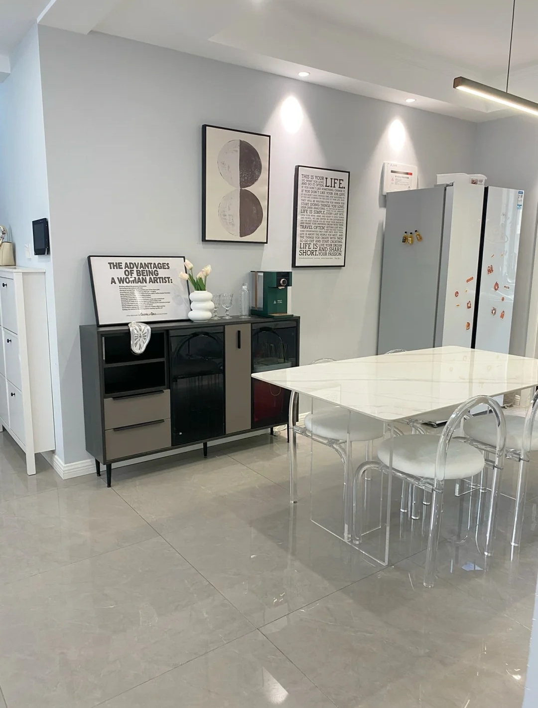 餐厅是三色变光的一米二长型吊灯,简单大方好搭配,还实用,餐桌是很流行的悬浮餐桌,亚克力的桌腿营造悬浮的既视感,整个空间轻盈了不少,简单的设计让原本不太明亮的餐厅增加了几分色彩。
