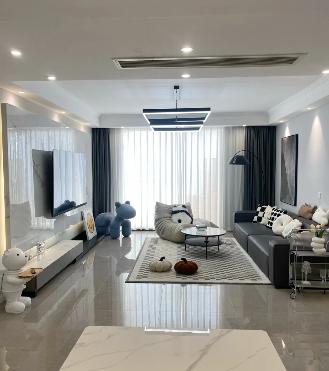沙发背景墙没有木饰面,乳胶漆直接上墙,百搭又好看,沙发选择了豆腐块沙发,坐感舒适,简约大方的外观跟整屋的风格很搭,关键是特别好打理,搭配毛毛虫懒人沙发,整个空间氛围更加慵懒舒适;