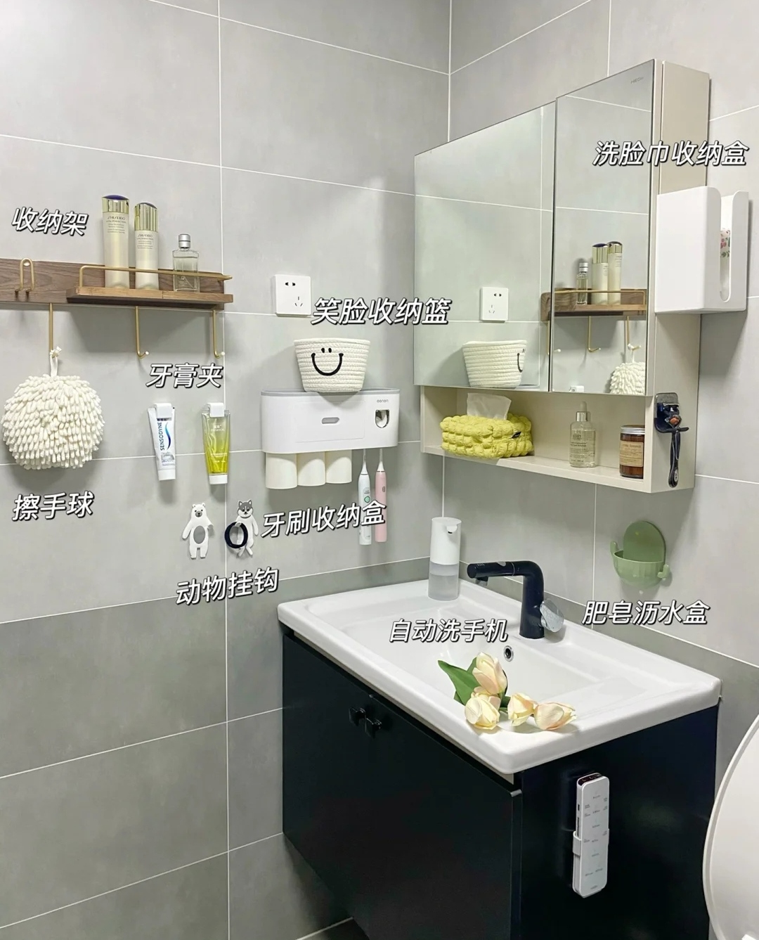 镜柜+浴室柜的收纳,搭配各种免打孔的收纳,让台面更加整洁干净,洗脸巾收纳盒:抽放很方便,能卫生整洁的收纳洗脸巾,吸盘牙膏夹:用过就知道,便宜又好用,牙刷置物架:收纳牙膏牙刷,干净整洁。