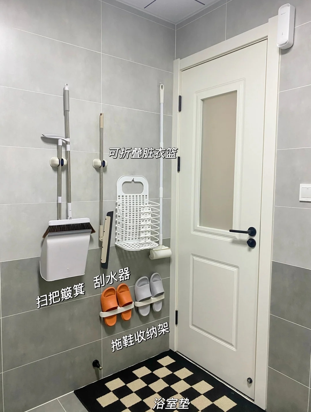 拖鞋置物架:拖鞋放上正好,可折叠脏衣篮:洗澡换下的衣服放进去很方便,不用的时候还可以折叠起来,可折叠扫把:可以折叠上墙,节省空间。